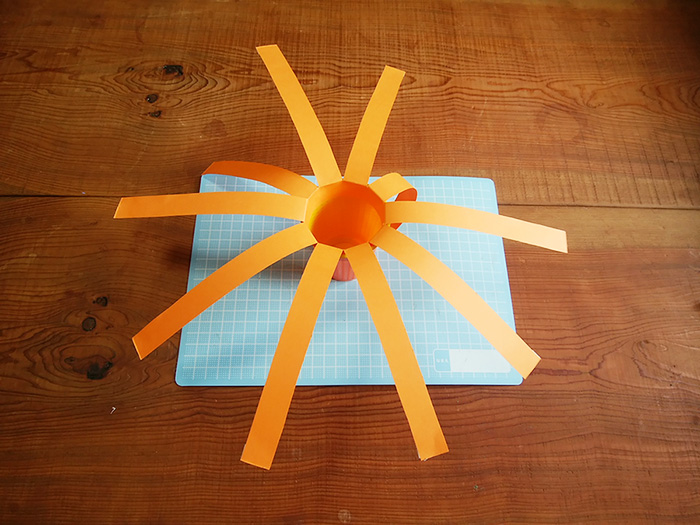 オレンジ色の画用紙の長い辺を、紙コップの飲み口にくるりと巻いて長さを合わせ、余った部分を切り取ります。