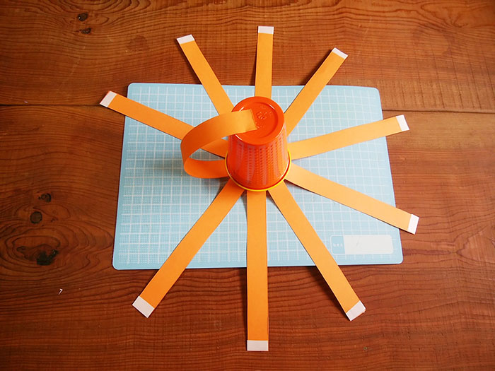 細長い画用紙の先へ両面テープを付けて、それぞれをコップの底へ貼り付けます。