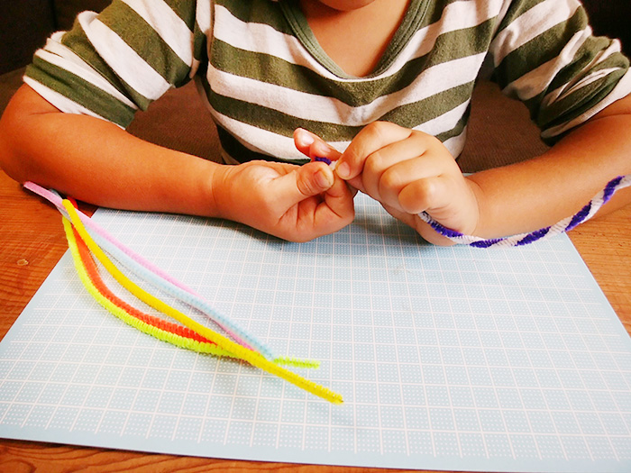 2本のモールをねじって1本にする作業をやってもらいましょう。