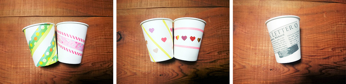 マスキングテープやシール、レースやリボンなどを紙コップに貼ると、可愛く華やかに。