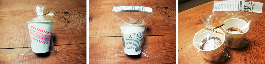 4でできた生地をスプーン等で紙コップに入れます。