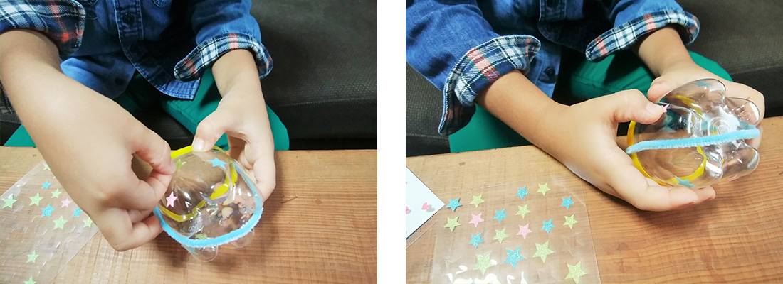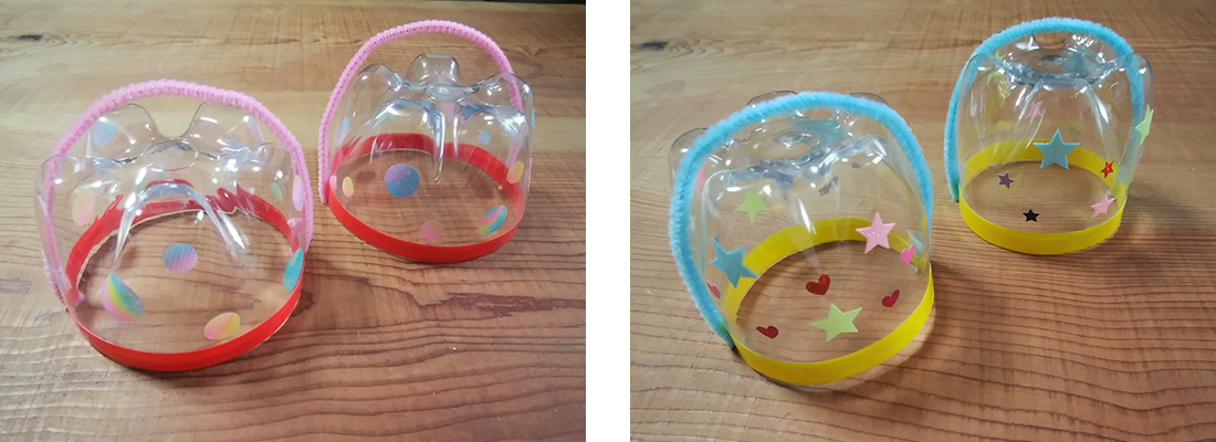 - ペットボトルの側面に好きなシールを自由に貼ります。これを2つ作ります。切り口を下にして、モールを上にあげます。