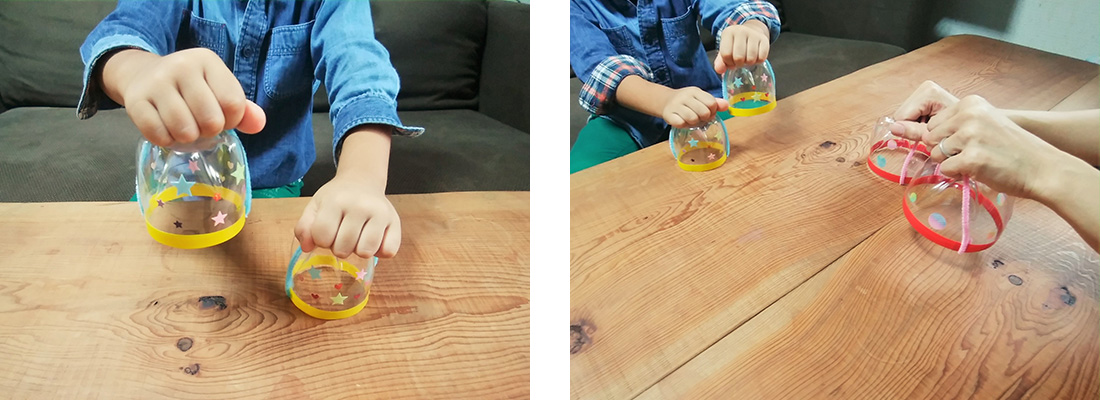 子どもは500ml、大人は2Lのペットボトルを使って作りました。お互いの手の大きさにぴったりフィットして、できあがりに大満足♪「馬の足音ってどんな感じだっけ?」と、ゆっくり動かしたり速く動かしたり、親子でいろいろ試行錯誤して楽しみました。テーブルに弱くあてると「遠く」、強くあてると「近く」に聞こえるなど、強弱による音色の違いも楽しめます。