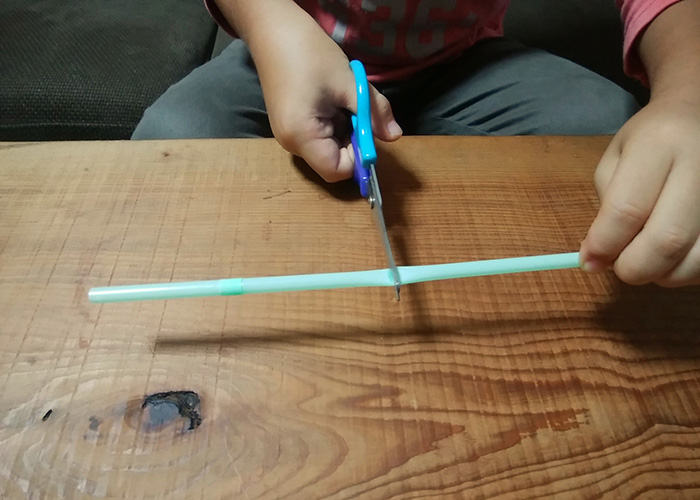 - 1本のストローの中心をつぶしながら、半分くらいの深さまで、三角に切り込みを入れます。