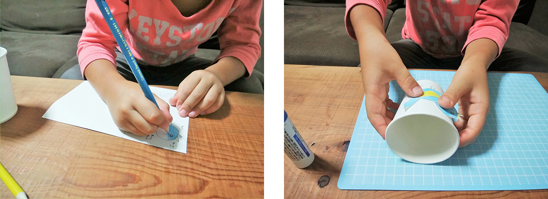 片手で紙コップを持ち、長いほうのストローの先を1~2センチ水に差し込んで、上のストロー、または下のストローに息を吹いて音を出します。