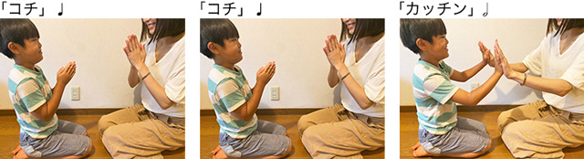のリズムで、<手拍子+手拍子+両手をたたきあう>を繰り返します。