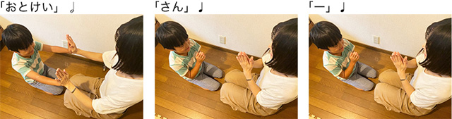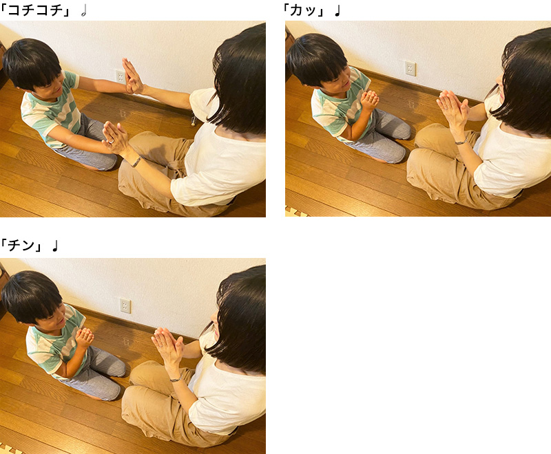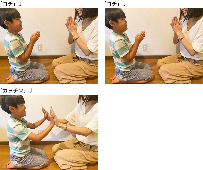 慣れてきたら、手をあわせるところ(二分音符の箇所)で、歌詞を大きくはっきり歌ったり、手をあわせる位置を変えたり、手だけでなく顔も近づけたり……など、さまざまなアクセントを追加。