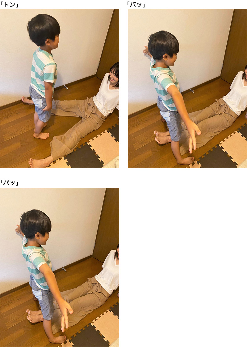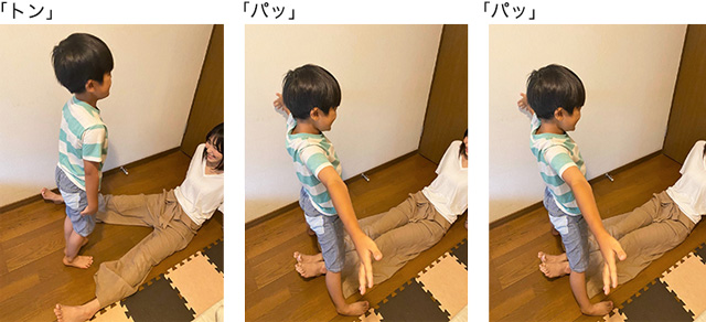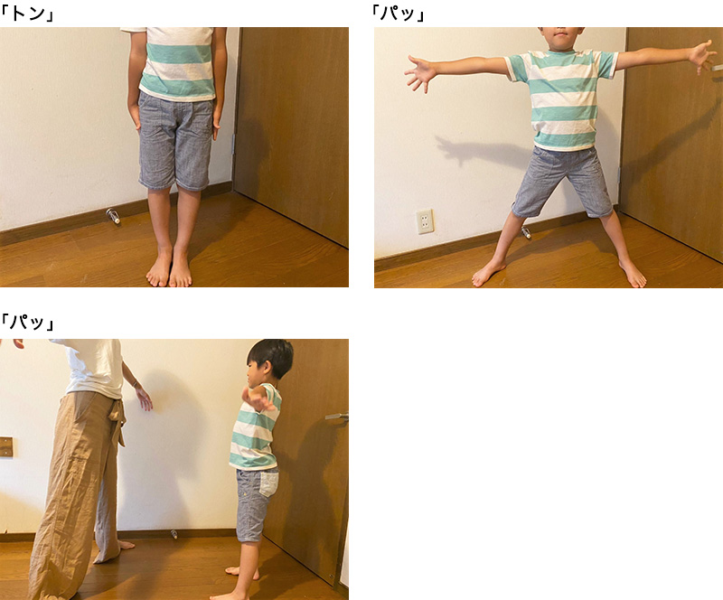 2.「トン」でお子さんは足をそろえてジャンプし、「パッ」「パッ」で、おうちの方が閉じた足の外側でお子さんが両手両足を開いて2回ジャンプします。これを繰り返します。