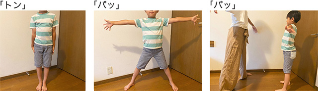 2.一定のリズムで、「トン」「パッ」「パッ」と言いながら、<軽くジャンプして両手両足を閉じる→軽くジャンプして両手両足を開く→両手両足を開いたまま軽くジャンプする>を繰り返します。