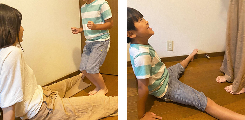 1.おうちの方は足を開いて座り、お子さんはその間に立ちます。