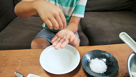 2.手のひらを水で濡らし、そこに塩をひろげます。