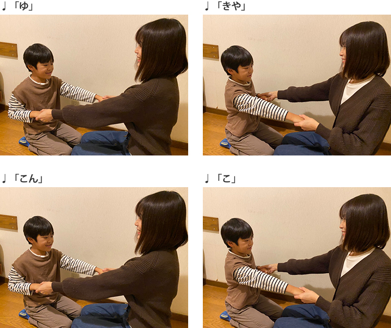 2.「ゆき」の歌に合わせて、歌いながら、♩のリズムで左右交互に手を引っぱり合います。