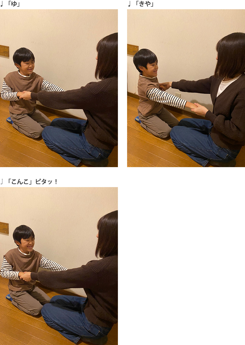・おうちの方が♩のリズムを意識して、歌いながら行いましょう。そうすることで、お子さんは、よりリズムの感覚が身につきます。