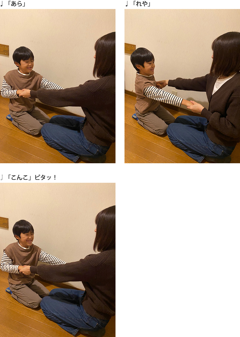 」のリズムで、左右交互に手を引っぱり合います。「