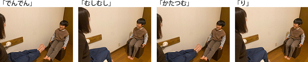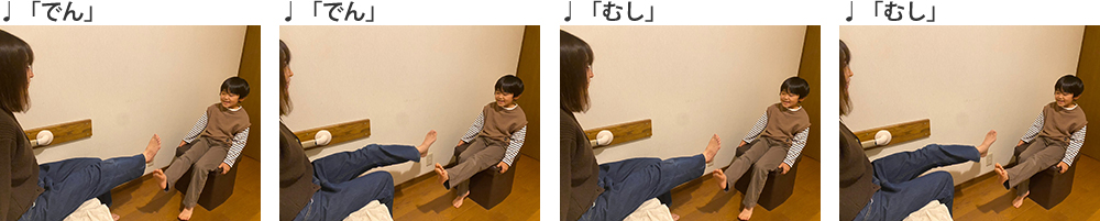 2.「かたつむり」の歌にあわせて、歌いながら1小節ごとに両足を上げたり下げたりします。