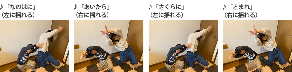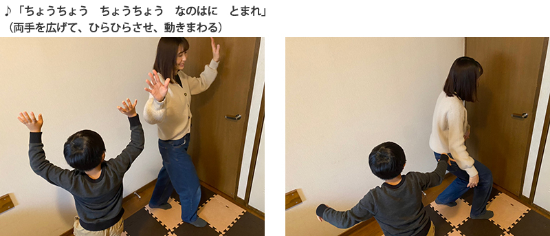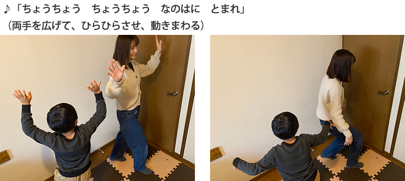 ◆「ちょうちょう」の歌に合わせて、歌いながら4小節ごとに、親子がそれぞれ1・2を繰り返します。