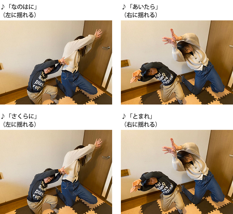 その場で片方のひざを立ててしゃがみ、両手の甲を上で合わせ、1小節ごとに左右に揺れます。