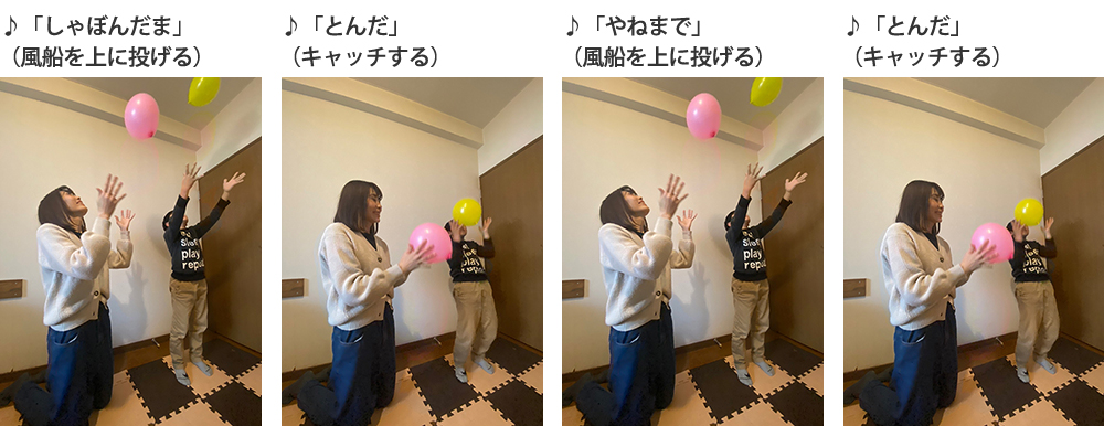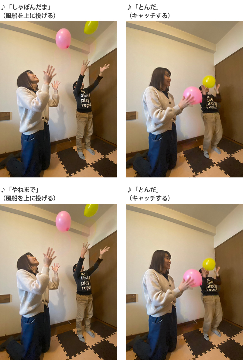 2.「しゃぼんだま」を歌いながら1小節ごとに、<風船を軽く上に投げる+風船をキャッチする>を繰り返します。
