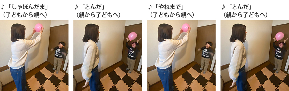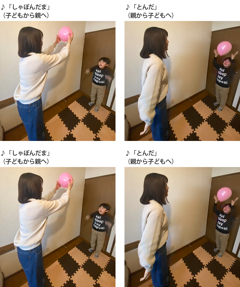 2.「しゃぼんだま」を歌いながら1小節ごとに、<風船を相手に投げ、相手がキャッチする>を、交互に繰り返します。
