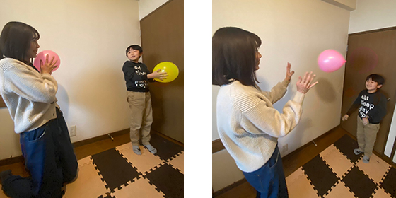 ・風船は高く上げすぎるとキャッチするタイミングが難しくなるので、軽く投げるようにします。