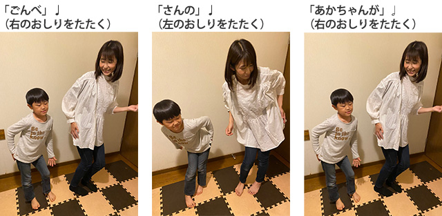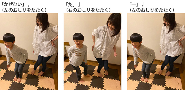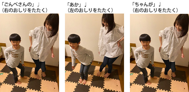 のリズムで、<おしり(腰)を右にふって、右手で右のおしりをたたく+左にふって、左手で左のおしりをたたく>を繰り返します。