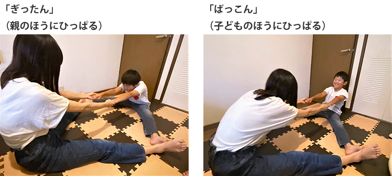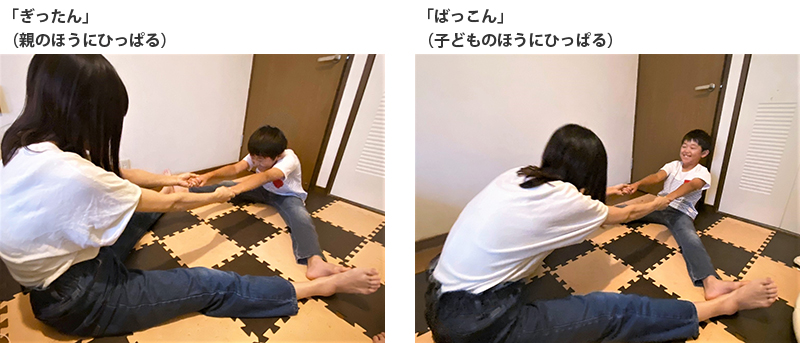 2.足の裏を合わせて、両手をつなぎ、一定のリズムで「ぎったん」「ばっこん」と繰り返しながら、交互に両手を引っぱり合います。