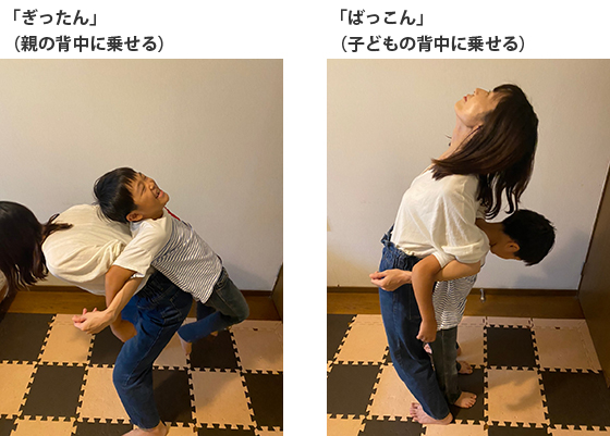 2.一定のリズムで「ぎったん」「ばっこん」と繰り返しながら、交互に背中を伸ばして、背中に相手の背中を乗せます。