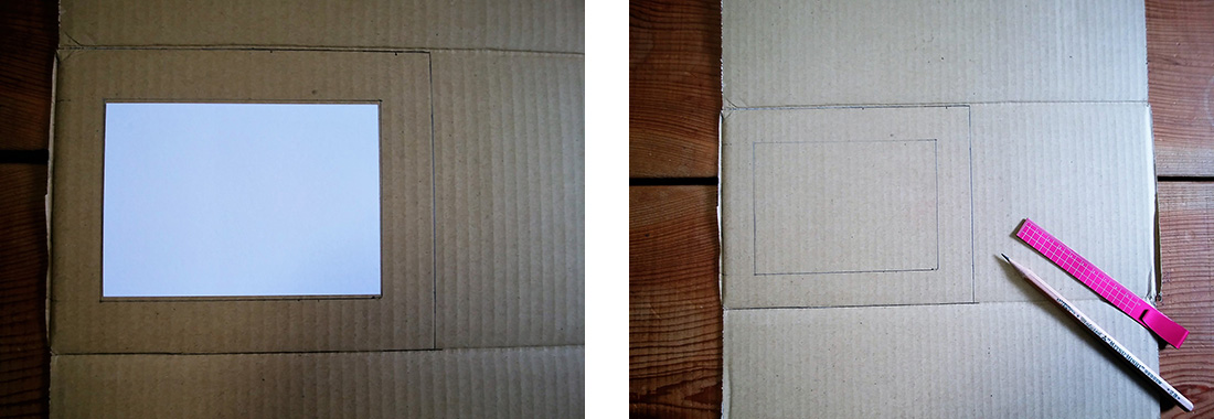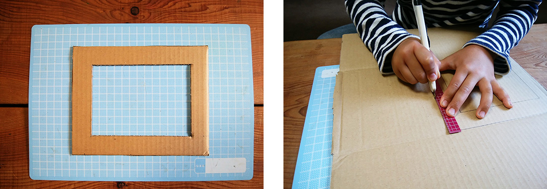 1.えんぴつと定規で、段ボールにフレームの形を書きます。