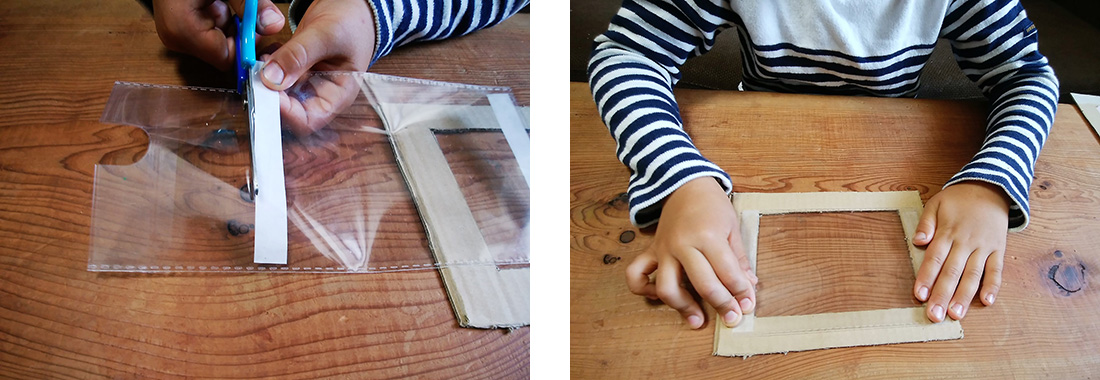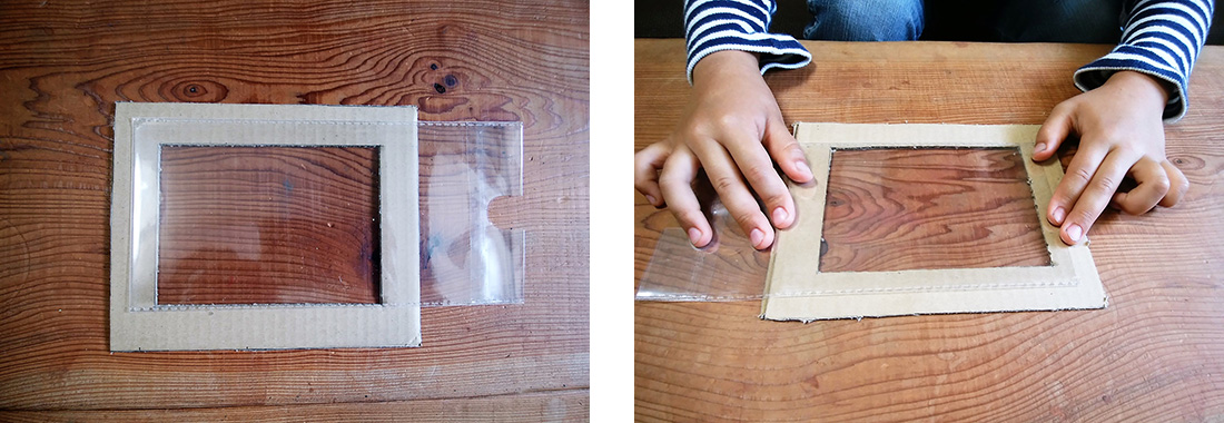5.両面テープの外側に沿ってビニール袋を切り、閉じている辺をフレームの下辺に合わせて、ビニール袋を貼り付けます。