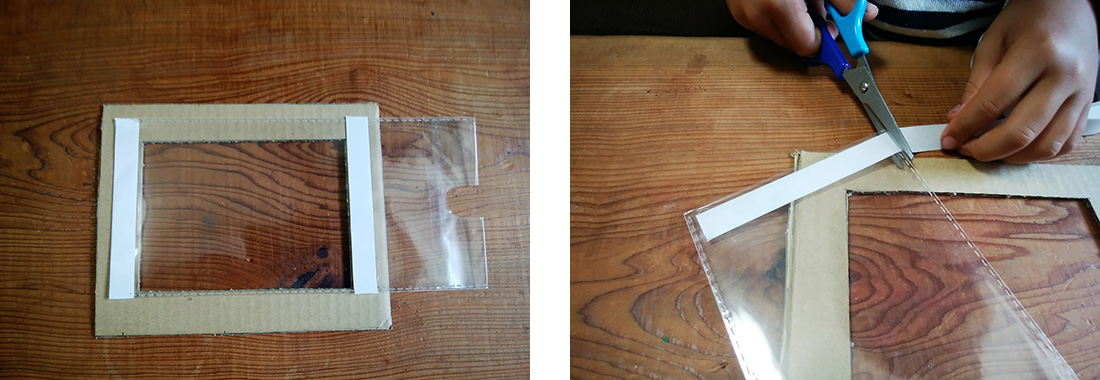 4.位置合わせしたビニール袋の上から、左右の部分に両面テープを貼り付けます。