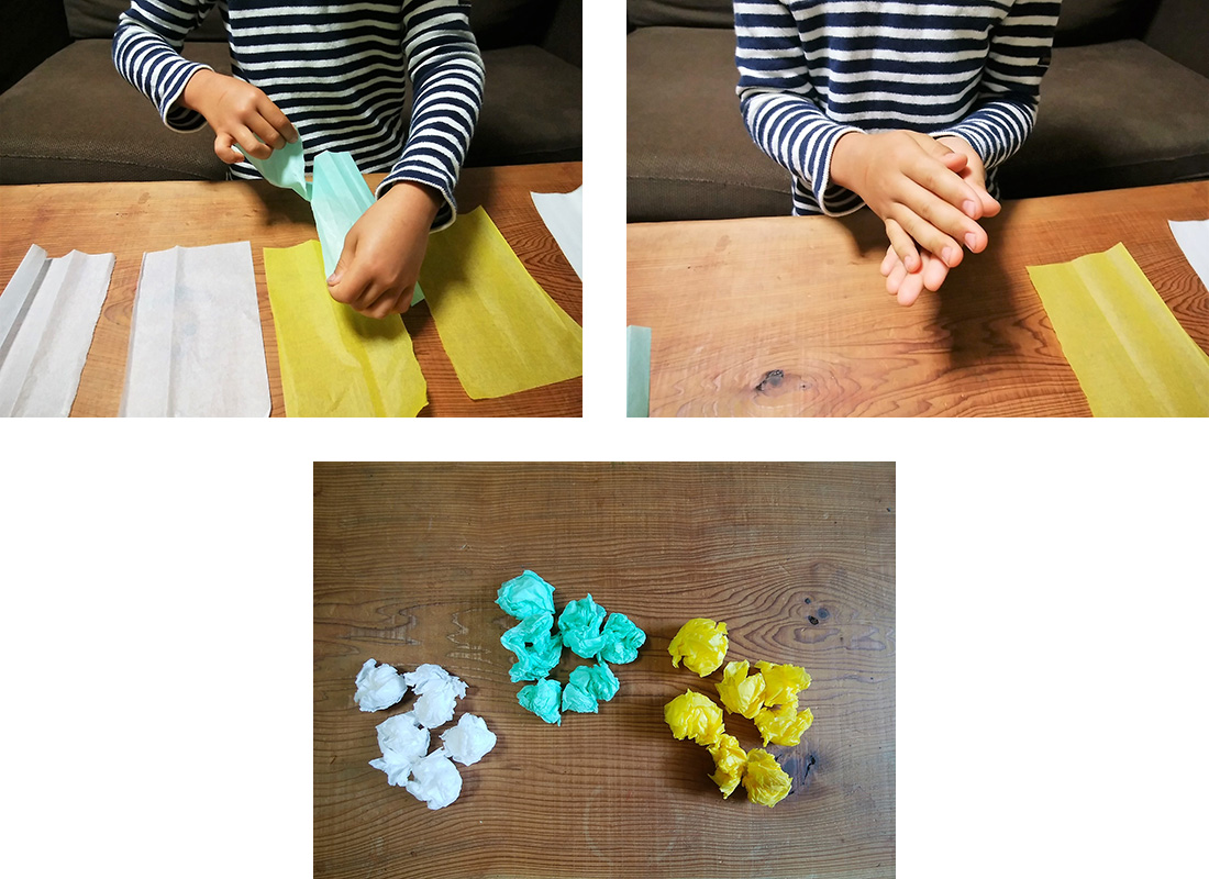 お花紙を半分の大きさにちぎり、一枚ずつ手でクシャクシャと丸めます。