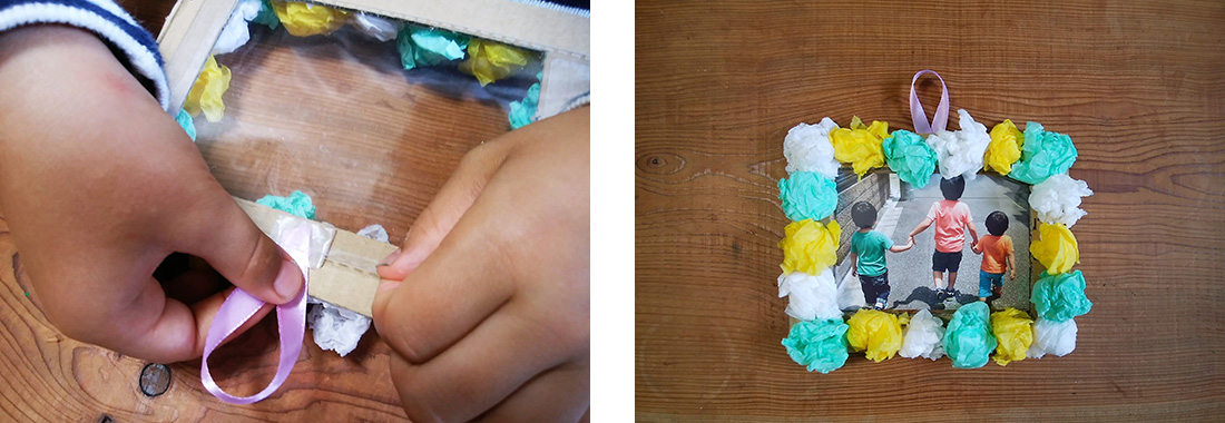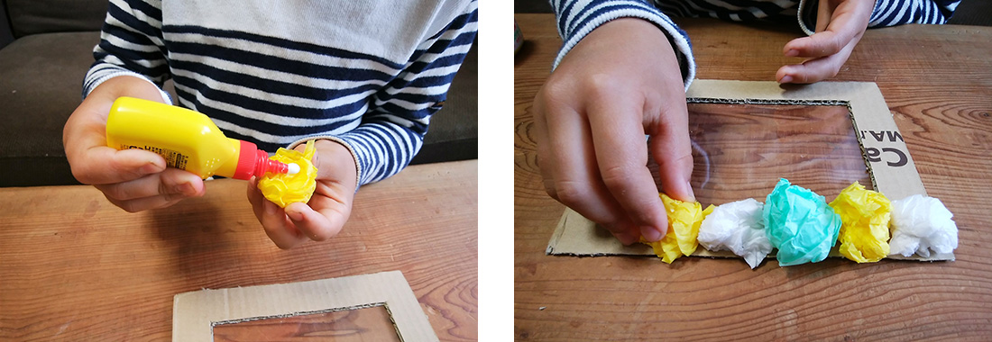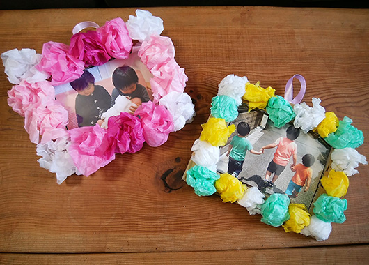7.色合いや場所などのバランスを見ながら、丸めたお花紙をボンド(のり)でフレームに貼り付けます。