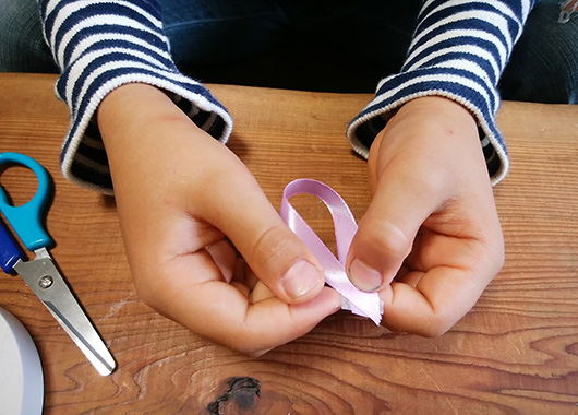 リボンを適当な長さに切り、輪っかにしたら、両面テープで両端を貼り合わせます。