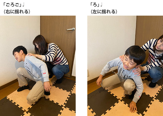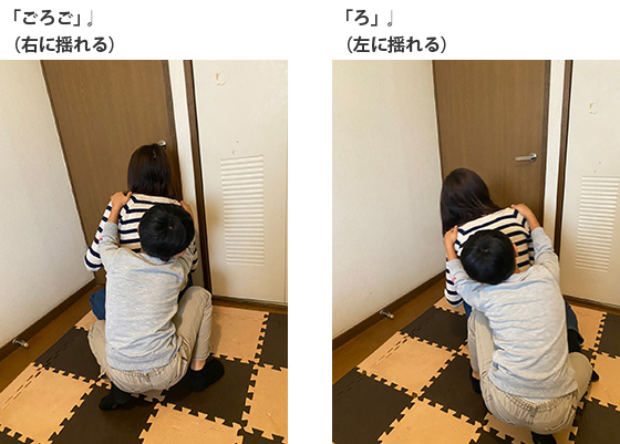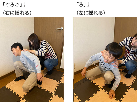 1.親子でしゃがみ、今度はお子さんが先頭になって、おうちの方はお子さんの肩に手をのせてつながります。
