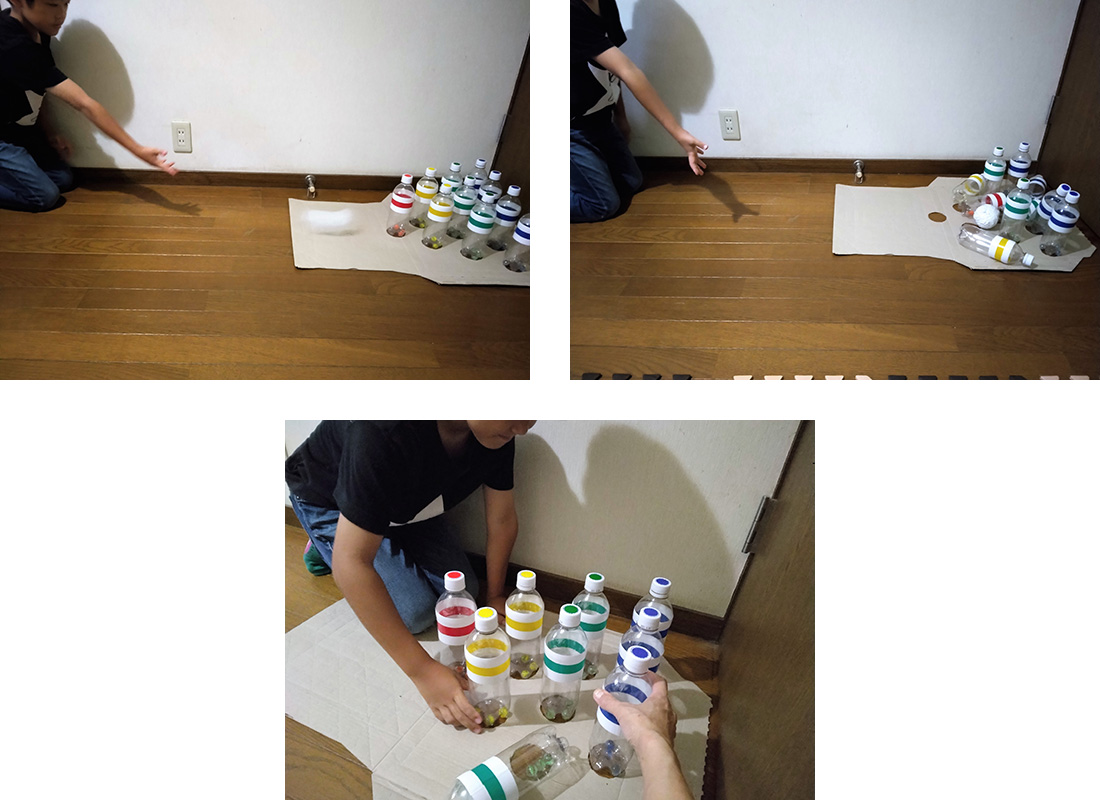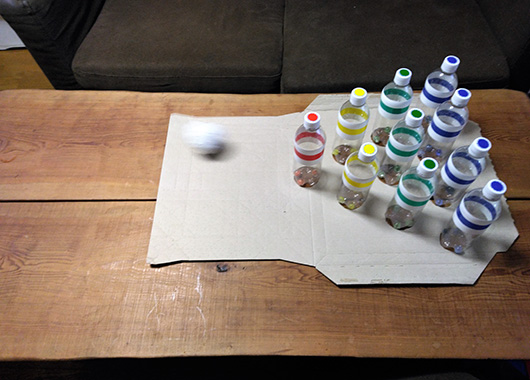 以前から空のペットボトルを使い、ボーリングごっこをして遊んでいたのですが、簡単に倒れるのですぐ飽きてしまったり、うまく並べ直せなくてやめてしまったり、なかなか上手に楽しむことができませんでした。