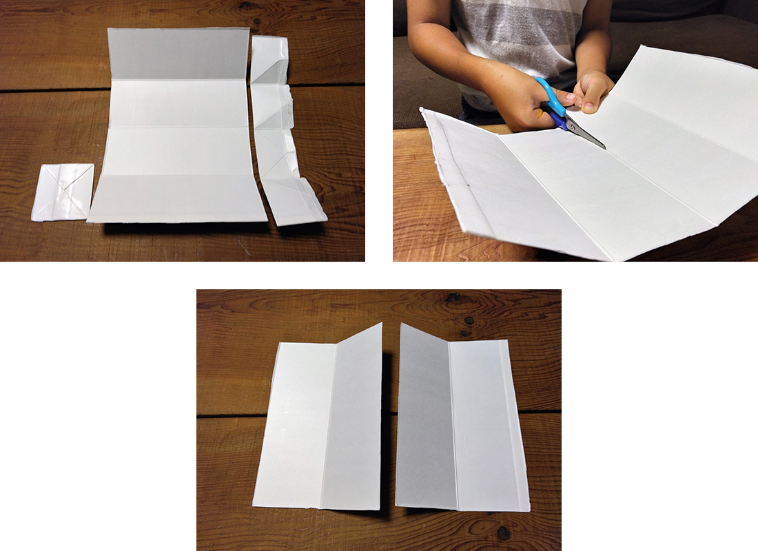 牛乳パックを開いて、上と底の部分は切り落とします。