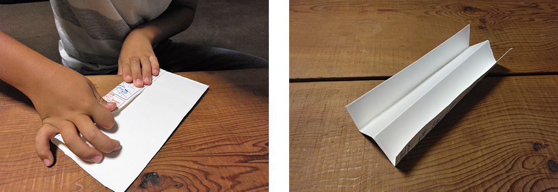 2.2面ずつに分かれた牛乳パックのうちの1つを、両側を縦に折り返して(谷折りにして)山のかたちにします。