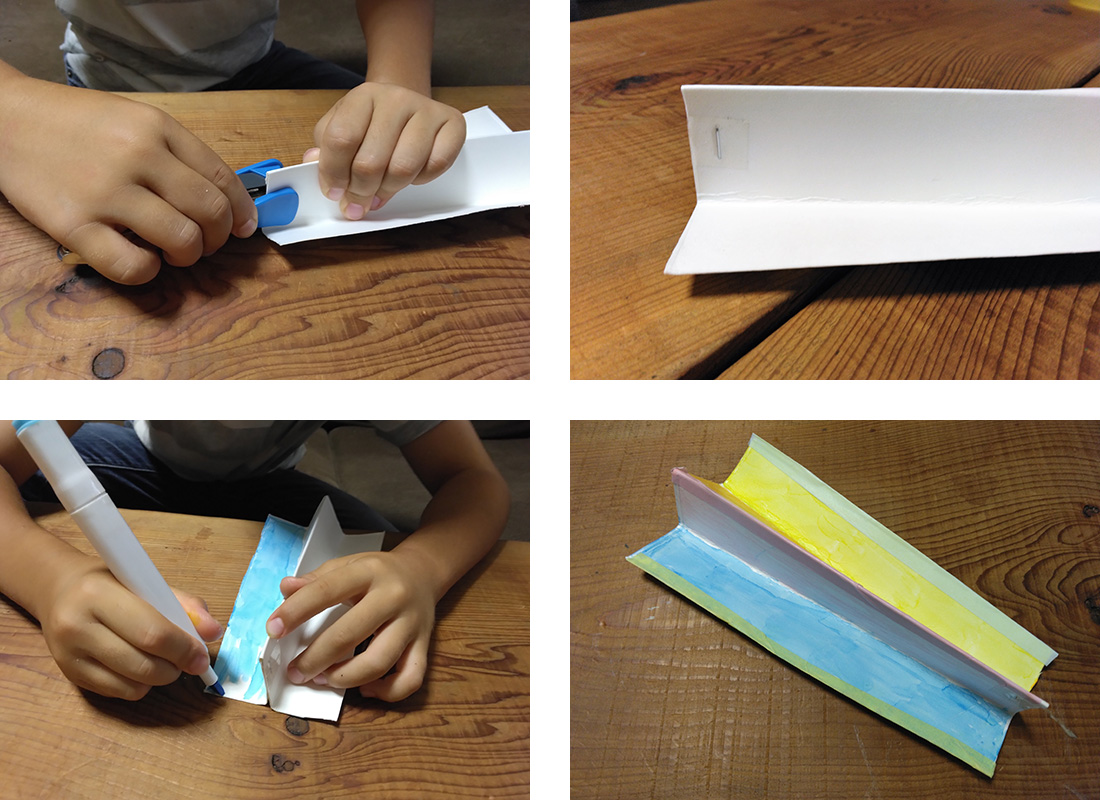 3.山になっている片側だけをホチキスでとめたら、けがをしないよう上からセロハンテープを貼ります。