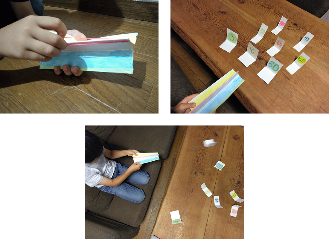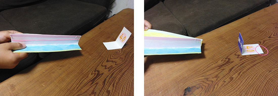 輪ゴムの発射台があまりに簡単にできあがり、「ほんとに飛ぶの?」と半信半疑な息子でしたが、試してみると、シンプルながら威力は抜群!