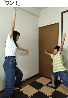 体を動かすのが大好きな息子は終始ノリノリで、「ワン」「ツー」のまねっこポーズも、「スリー」の違うポーズも難なくクリア!