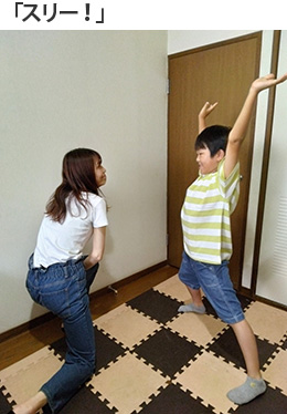6.次におうちの方は「スリー」と言いながら、また別のポーズをし、他の人たちは、そのポーズにつられないように、違うポーズをします。