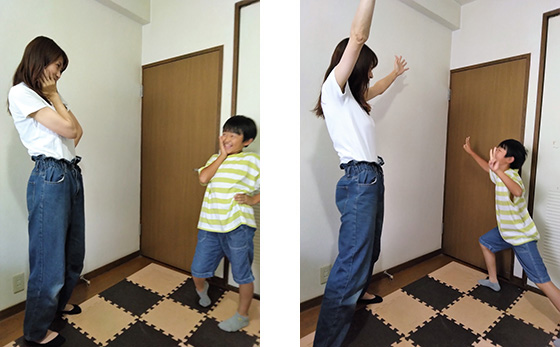 ・おうちの方は、手足を上げたりしゃがんだりして、毎回できるだけ違う躍動感のあるポーズをしましょう。そうすることで、子どもたちは喜び、あそびが盛り上がると共に、表現する楽しさを味わえます。