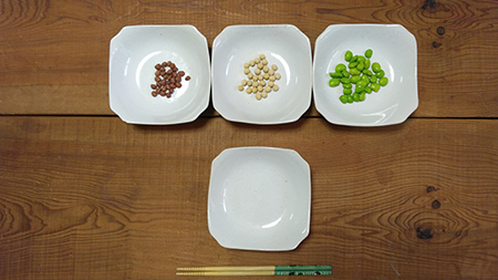 「ぼく箸つかうの得意だよ!」という息子に枝豆、大豆(乾燥)、小豆(乾燥)の3種類の豆を用意。
