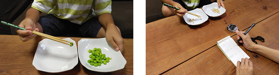 右手は、枝豆も大豆も30秒で30個近くも移動でき、本人も得意顔!