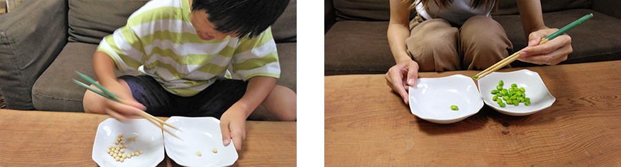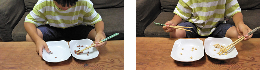2.箸で豆をつまんで、皿から皿へ移動させます。
