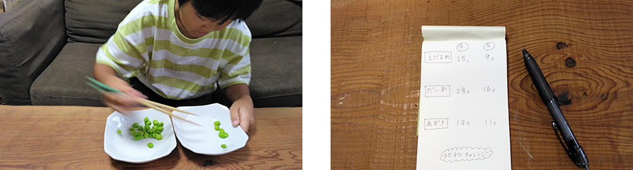 4.親子で、どちらが多く豆をはこべたか競争したり、利き手の記録に、反対の手がどれだけ迫れるかトライしたり、いろいろなルールで楽しみましょう。