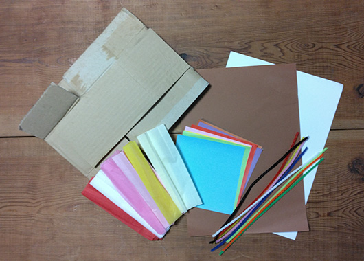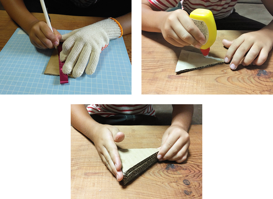 1.お好みのケーキの形にダンボールを切り取り、何枚か重ねてボンドで貼り合わせます。