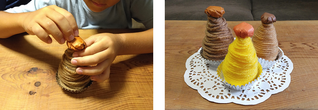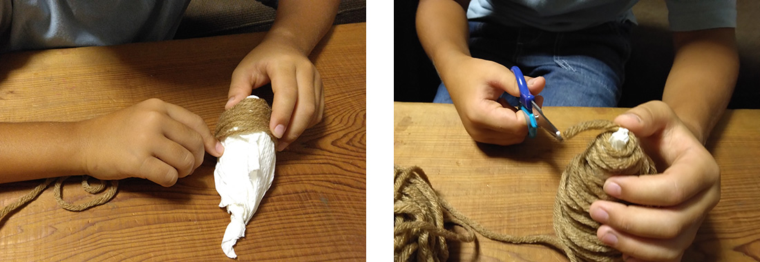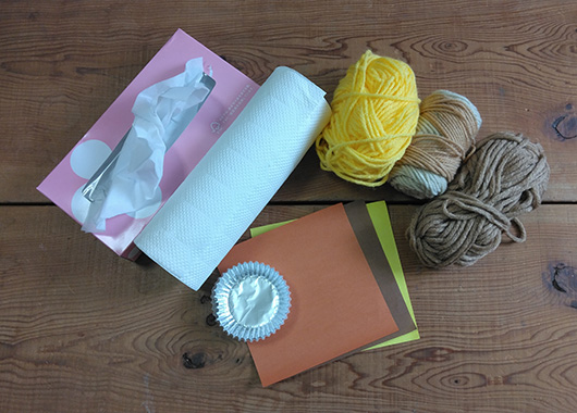 2.茶色や黄色系の毛糸をふんわりと巻きつけ、最初と最後を両面テープでとめます。