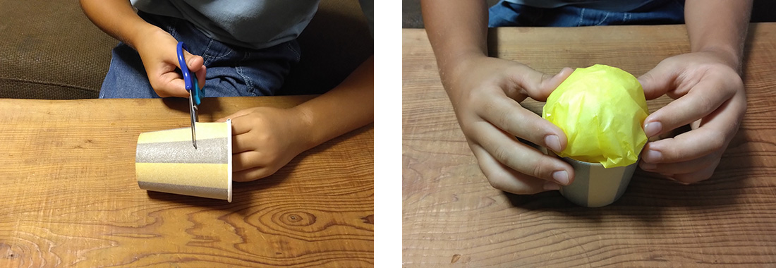 2.紙コップを横半分に切り、下の部分に1のお花紙をふんわりと入れます。