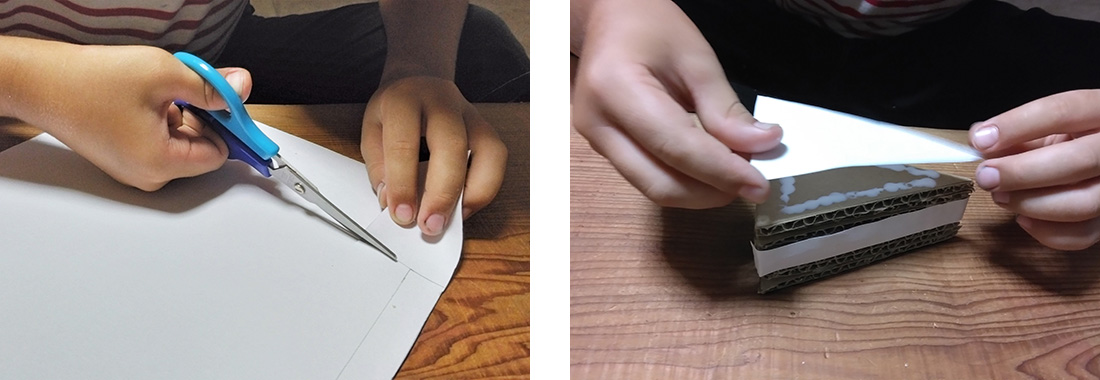 ショートケーキは、ダンボールをある程度の枚数重ねないとスポンジ感が出ないので、私も一緒にせっせと切り取り。(今回は8枚ほど重ねてみました)